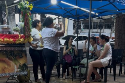 Turistas são vistas tomando tacacá com colher em barraquinha na avenida Nazaré, em Belém