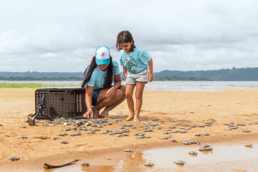 Crianças e jovens participam da soltura de milhares de filhotes de quelônios no Pará