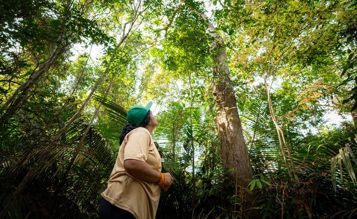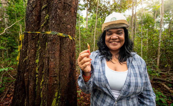 Ela lembra dos piores momentos da seca histórica de 2023 e 2024, com incêndios e fumaça densa, que afetou ciclos reprodutivos e atrasou a frutificação de espécies como a andiroba, sinalizando impactos das mudanças climáticas. “Foi um cenário de filme de terror! Tinha muita fumaça, não dava para enxergar o horizonte”, conta.