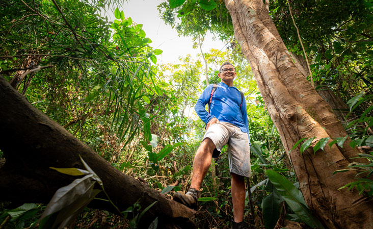 “Eu não tenho nem inveja, nem vontade de ir morar na cidade. Aqui eu me sinto livre”, diz José, com um sorriso no rosto. Nascido e criado na Flona do Tapajós, ele não precisa de GPS para se localizar nem mesmo tirar pausas para retomar o fôlego nas longas trilhas que cansam em minutos aqueles que não estão acostumados. “A floresta é minha segunda casa. Não tenho cisma e nem dúvida de errar, já está gravado na mente”, afirma.