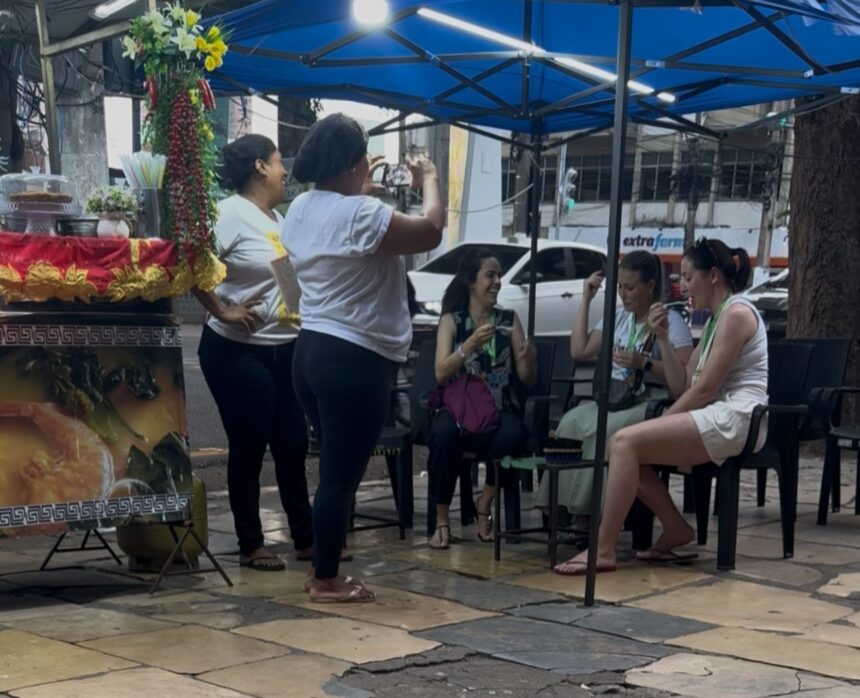 Apesar da adaptação, as turistas aparentemente aprovaram o sabor do tacacá e pediram que a vendedora registrasse o momento para compartilharem a experiência nas redes sociais.